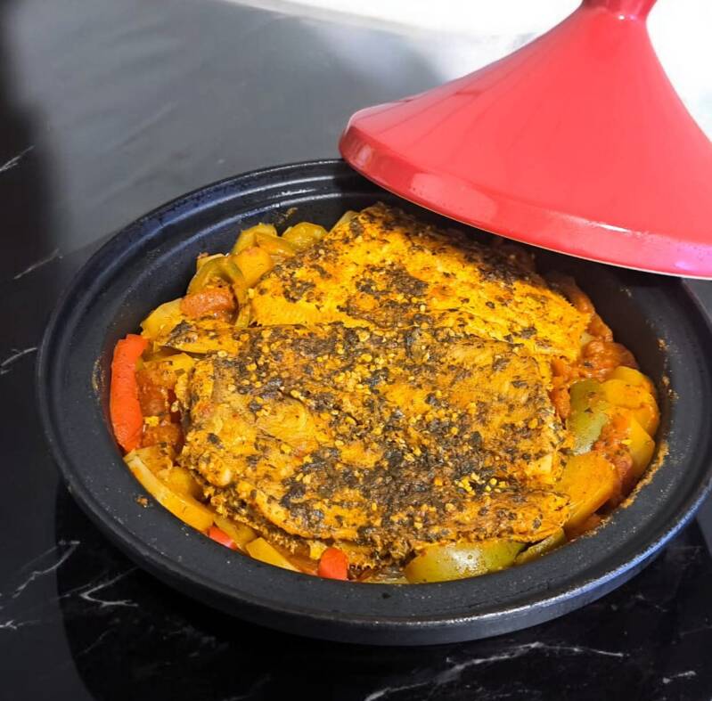 Wanneer de groenten bijna gaar zijn, leg ik de vis voorzichtig bovenop. Zo blijft hij mooi zacht en valt hij niet uit elkaar. Laat de tajine daarna nog even zachtjes verder garen tot de vis perfect gaar is.
